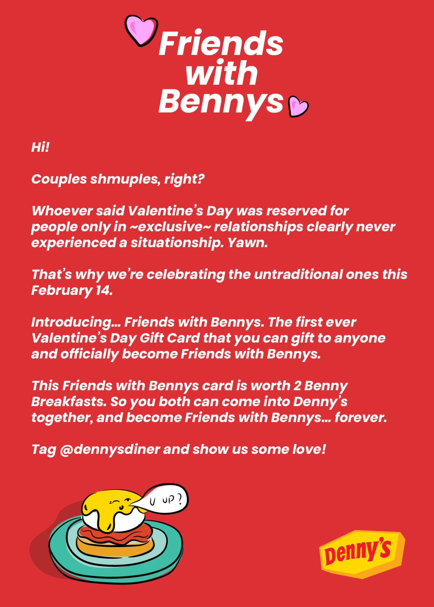 So we decided to zig when everyone else zagged, and celebrate an untraditional relationship. We created a saucy V-Day card that people could send to their friends, inviting them to become “Friends with Bennys.”